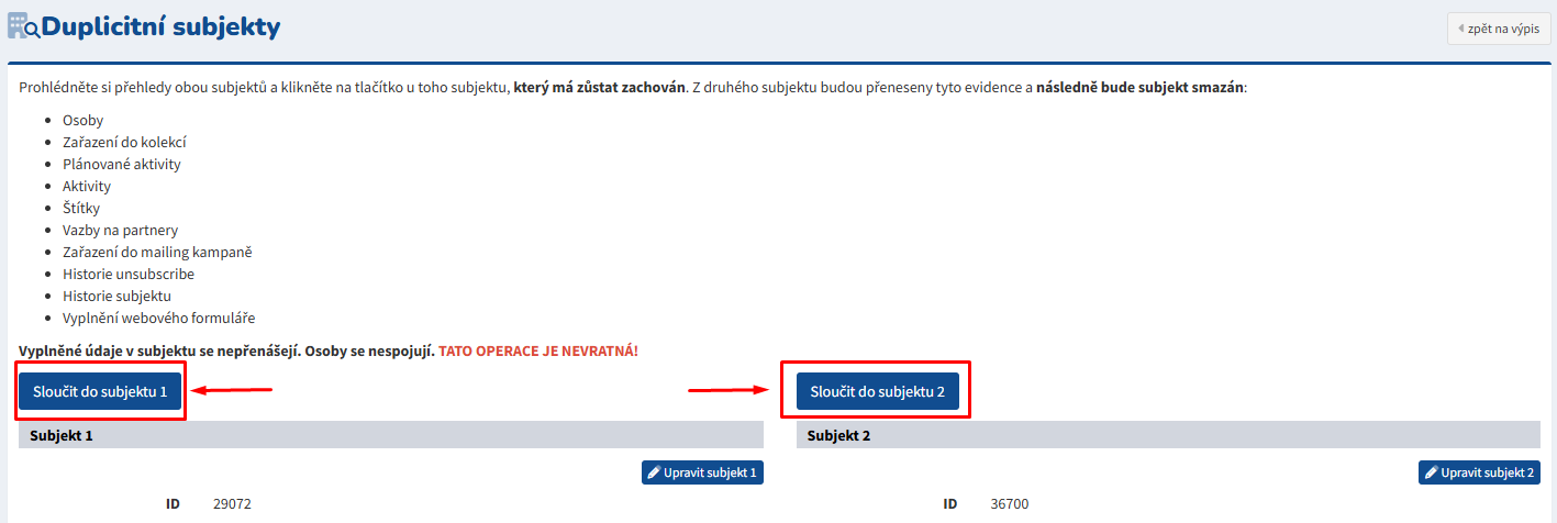 Systém převede vazby (kolekce, aktivity, štítky, historii), převede evidenci z druhého subjektu, odstraní subjekt, který byl sloučen jako duplicitní.