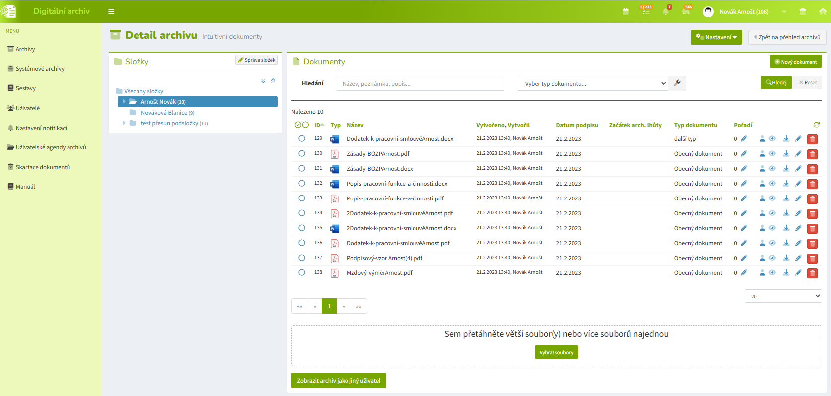 Po rozkliknutí ikony s číselným identifikátorem zobrazíte konkrétní Detail archivu. Dokumenty v archivu jsou organizovány do složek. Dokumenty lze zobrazit, stáhnout do počítače, upravit, odstranit a také k nim přiřadit uživatele.