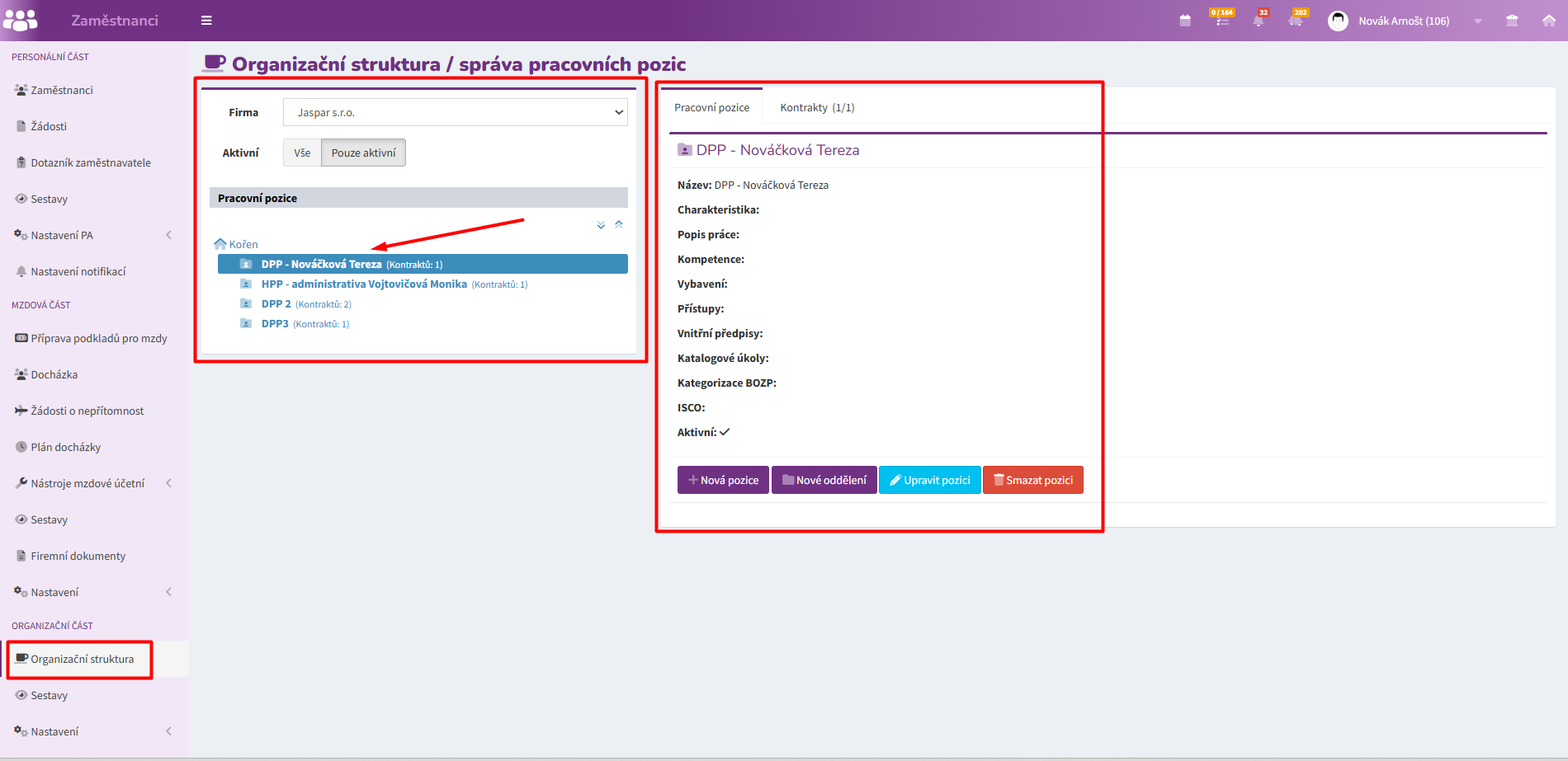 - Pozice se zobrazí jako položka pod příslušnou organizační jednotkou.