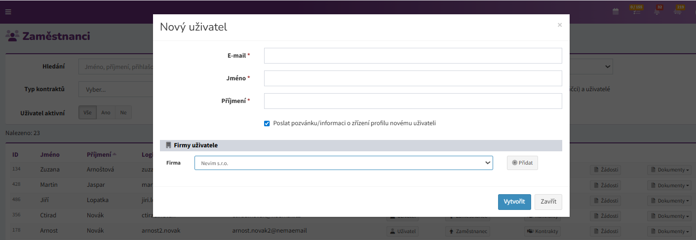 Tlačítkem Nový uživatel vyvoláte okno s formulářem – vyplňte základní údaje o uživateli a přiřaďte ho k příslušné firmě či firmám (potvrďte vždy tlačítkem Přidat).