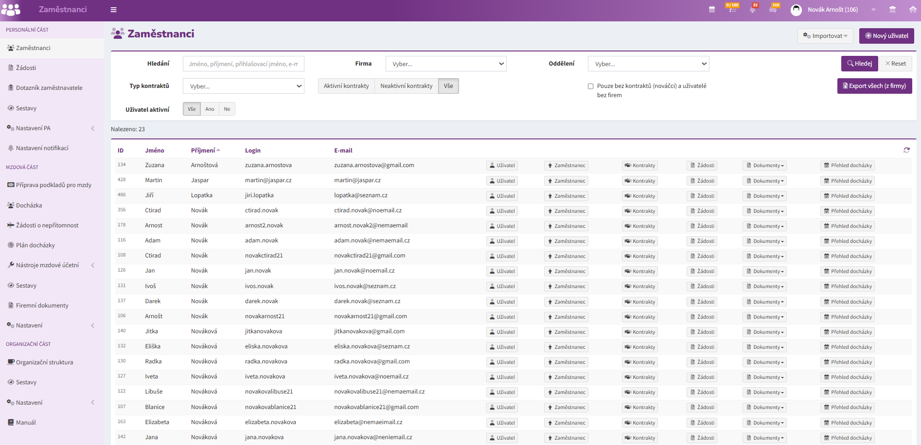 Tato sekce přehledně zobrazuje Vaše zaměstnance s kontakty, profily, kontrakty, dokumentací a přehledem docházky.