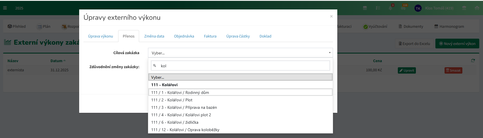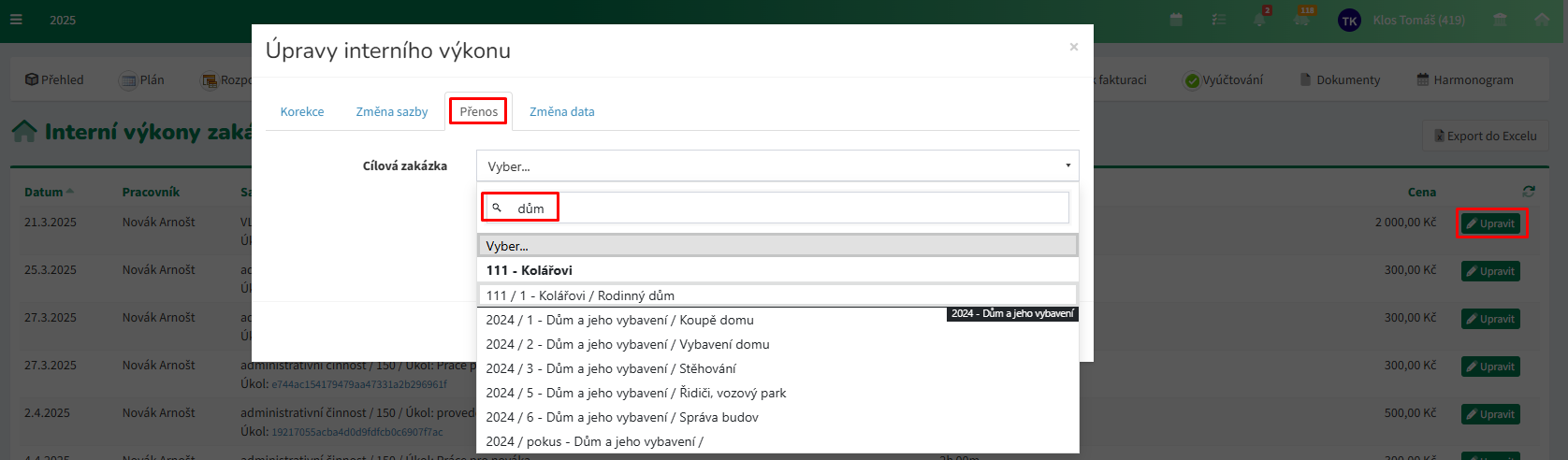 V případě potřeby je možné provést Přesun zakázky do jiného projektu kliknutím na stejnojmenné tlačítko.