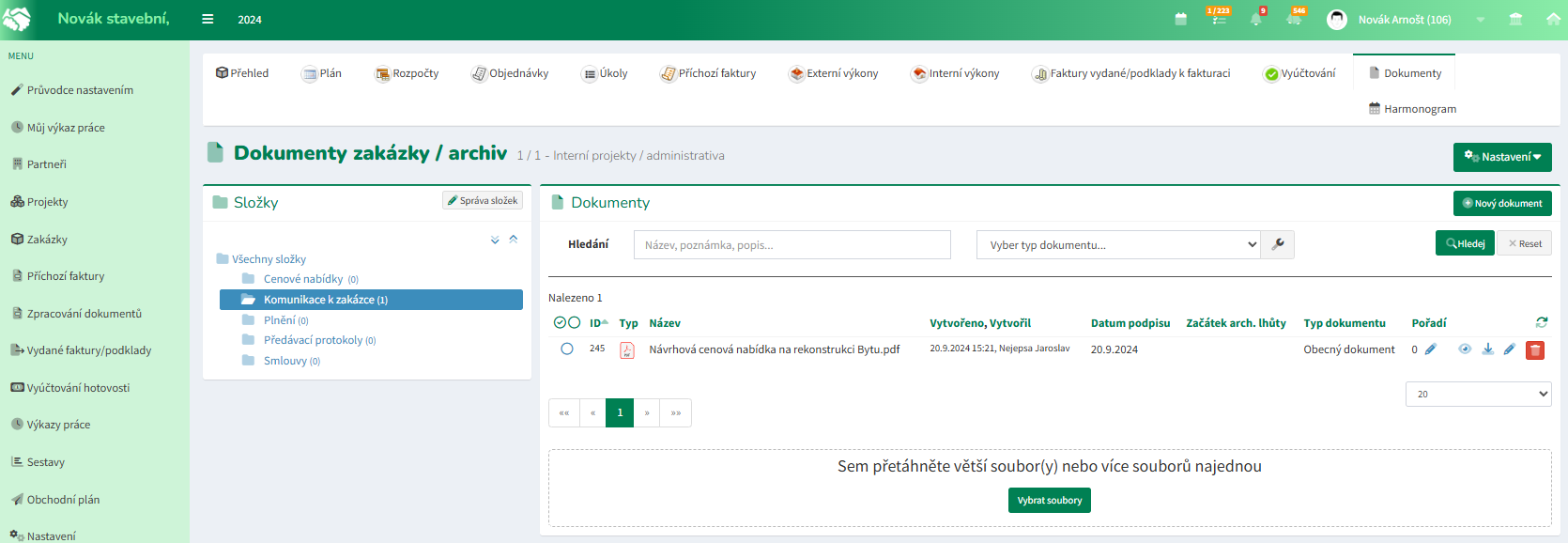 K umístění dokumentu do archivu slouží zvýrazněné pole, do kterého je možné přetáhnout soubor nebo více souborů z Vašeho počítače. Nahrávání souborů se spustí automaticky po přetažení souborů. O úspěšném dokončení Vás systém informuje a zobrazí aktualizovaný seznam dokumentů ve složce.
