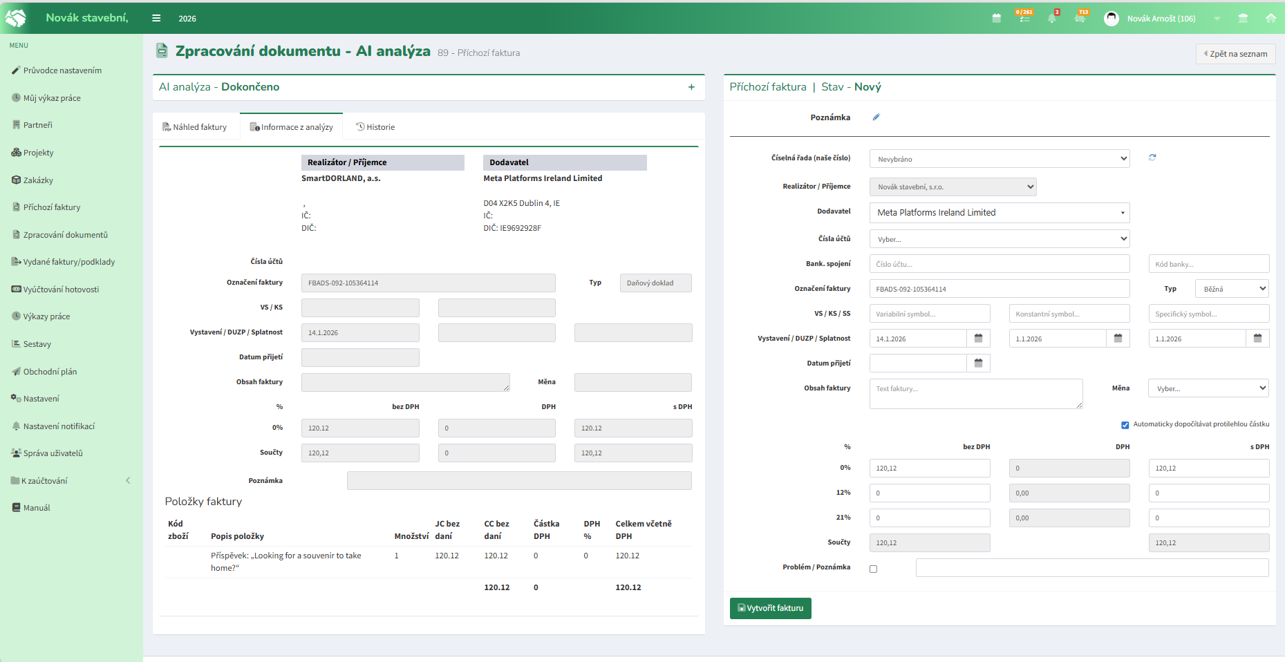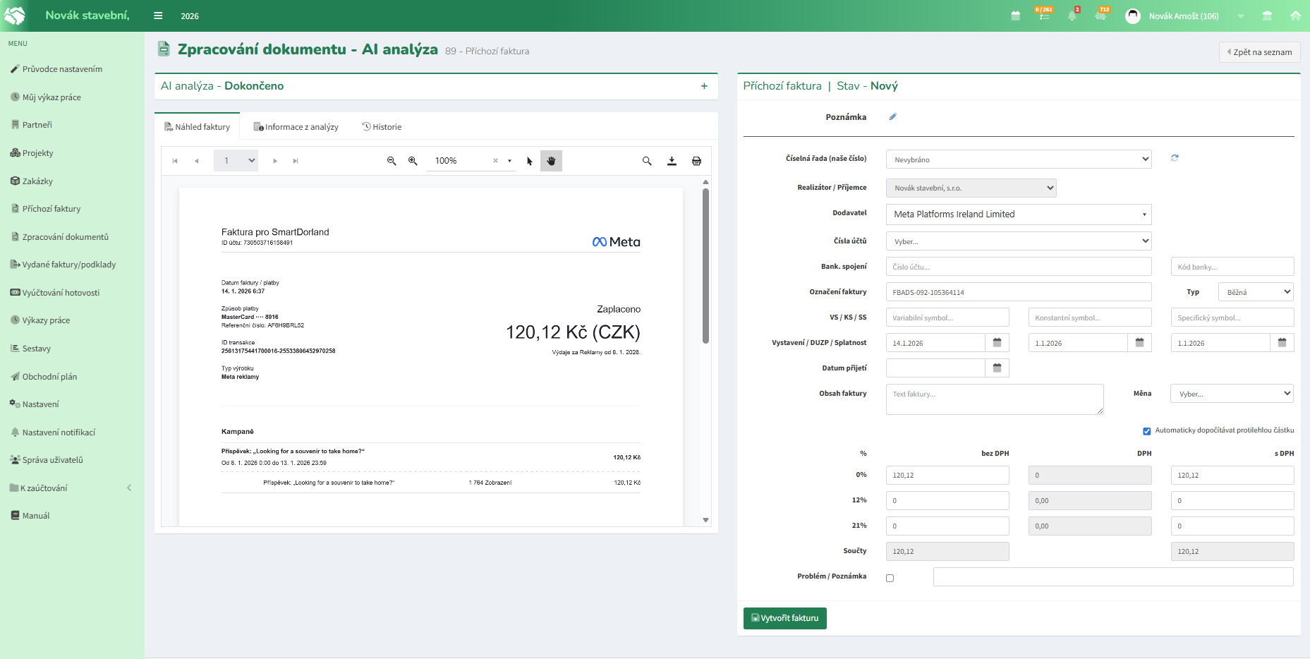 V případě úspěšné analýzy a existující vazby na dodavatele lze tlačítkem Vytvořit fakturu výsledek AI analýzy potvrdit a přejít na další dokument.